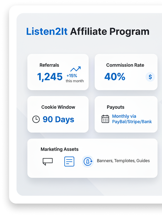 The Listen2It Affiliate Program gives creators, educators, agencies, and bloggers a simple way to earn recurring income by promoting one of the most trusted AI text-to-speech platforms. With over 150+ languages and accents, Listen2It helps businesses, educators, and marketers create natural AI voiceovers for training, ads, audiobooks, and more.