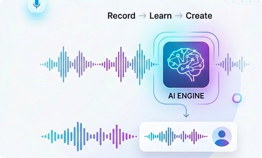 Our AI analyses your audio — studying your tone, pitch, rhythm, and natural inflection patterns. It builds a voice model that captures what makes your voice distinctly yours, not just the words you said.