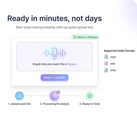 Upload a short recording — as little as a few minutes of clean audio — and your voice clone is ready to use. No lengthy training queues. No waiting for a team to process your files.