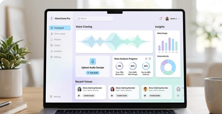 Record a short, clear audio clip — or upload an existing recording. A quiet room and a decent microphone are all you need. For instant cloning, a few minutes works. For professional quality, 30+ minutes gives you the best results.